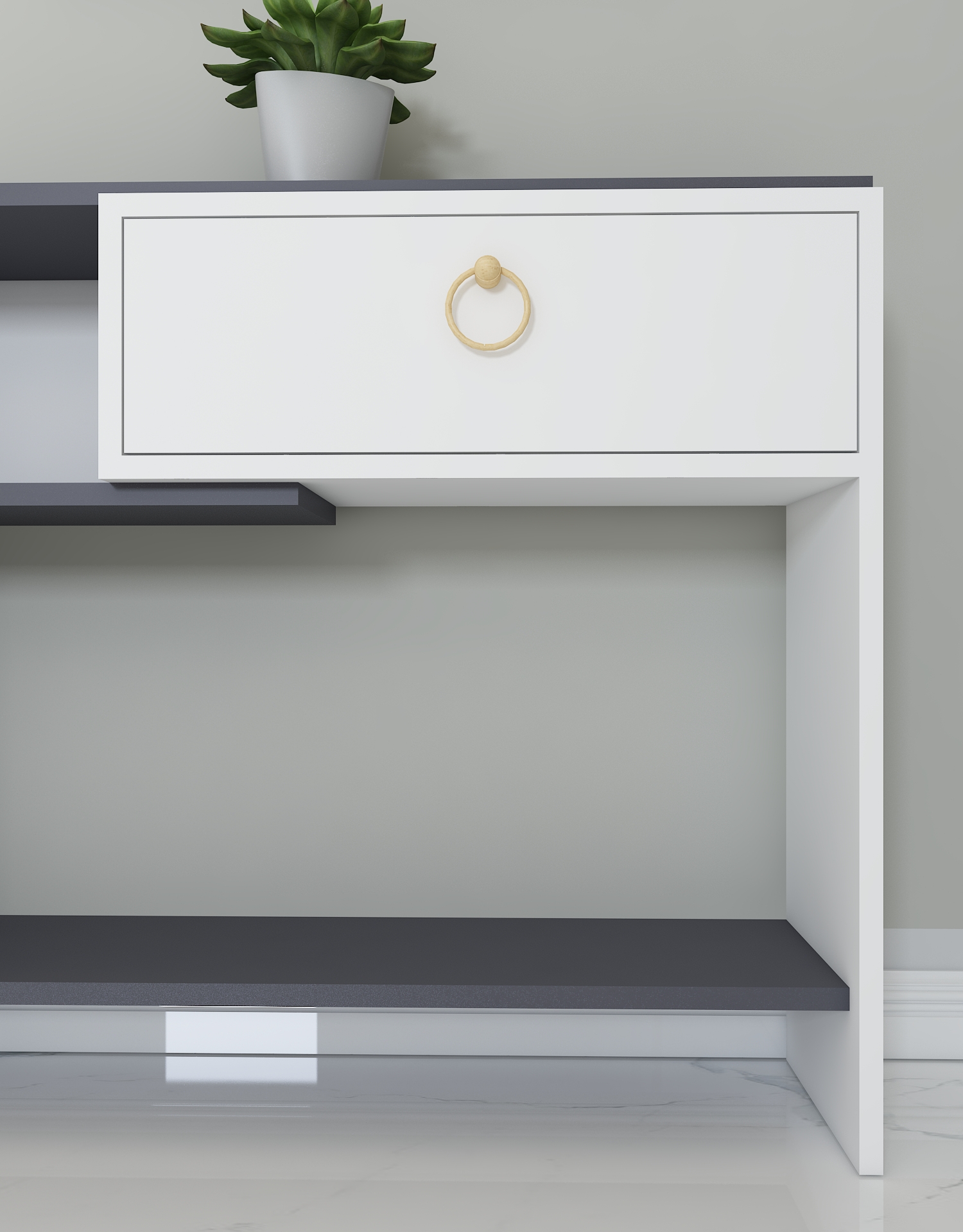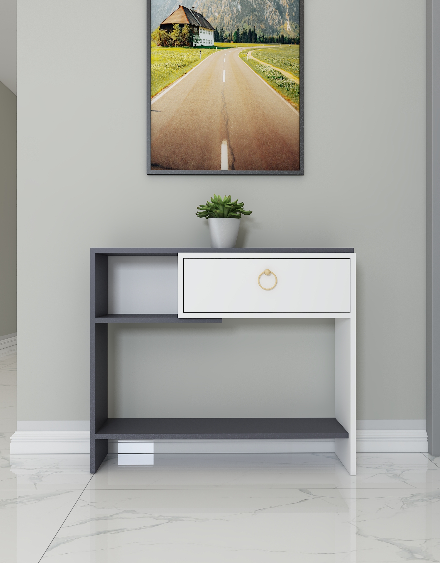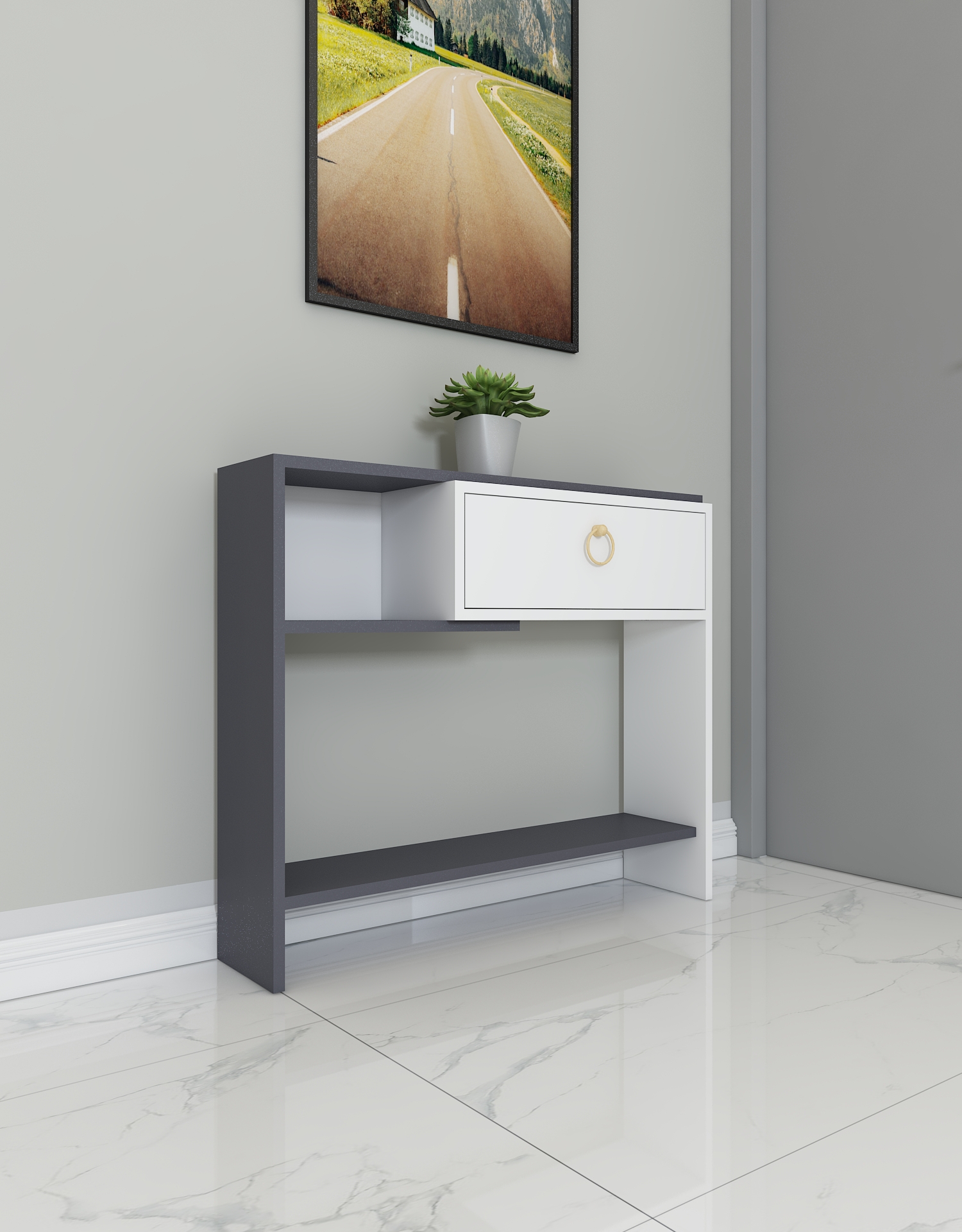 Evinizin girişinden salonuna kadar her köşesine şıklık katacak bu modern dresuar, antrasit ve beyaz renk kombinasyonuyla zarafeti minimalizmle buluşturuyor. 90 cm genişliği, 76,8 cm yüksekliği ve 22 cm derinliğiyle hem yerden tasarruf sağlar hem de dekoratif objeleriniz için ideal bir alan sunar.