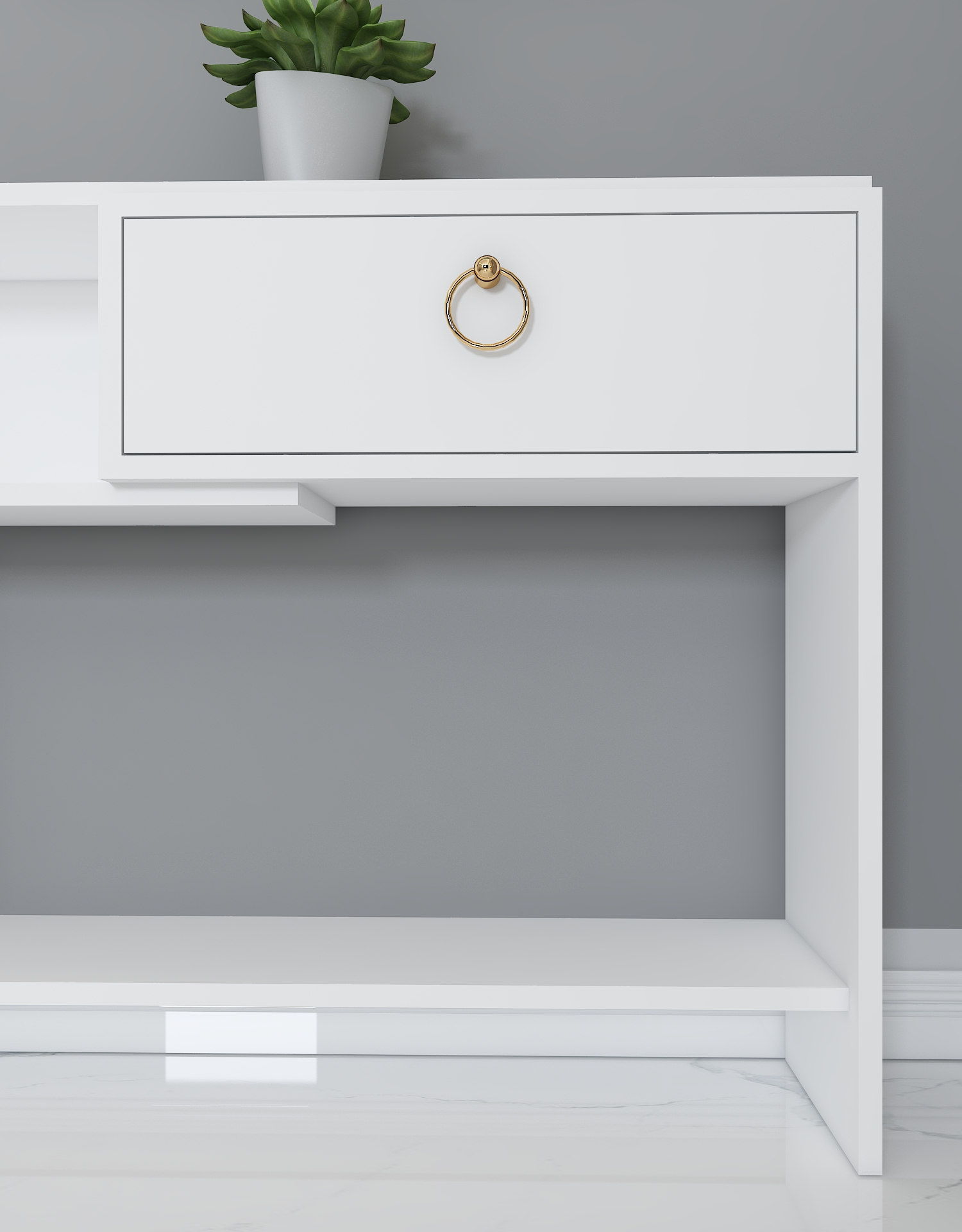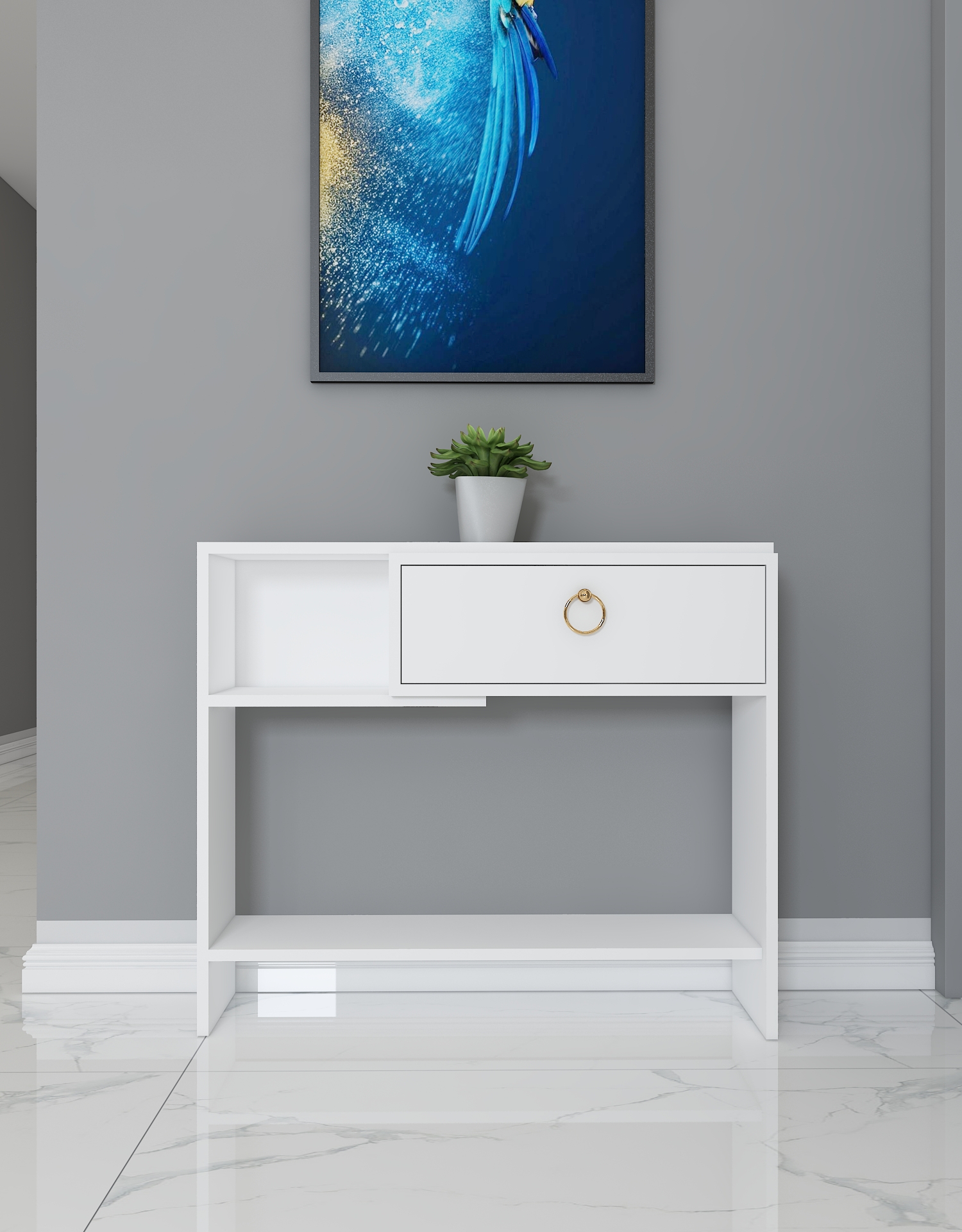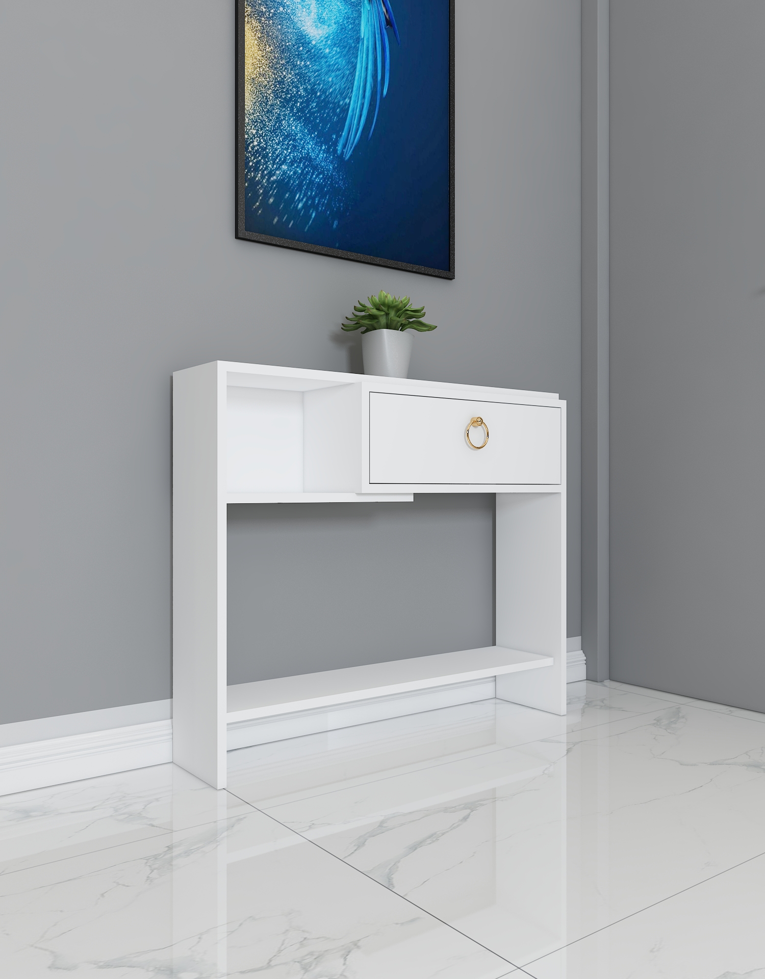 Evinizin girişinden salonuna kadar her köşesine şıklık katacak bu modern dresuar, beyaz renk zarafeti minimalizmle buluşturuyor. 90 cm genişliği, 76,8 cm yüksekliği ve 22 cm derinliğiyle hem yerden tasarruf sağlar hem de dekoratif objeleriniz için ideal bir alan sunar.